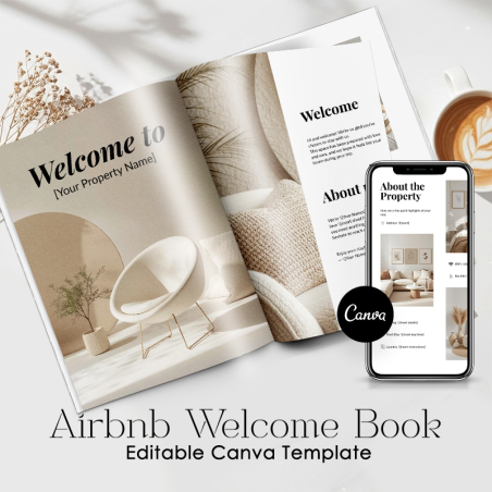 Welcome your guests in style with this Airbnb Welcome Book Canva Template — designed in a warm neutral palette with modern minimalist touches.